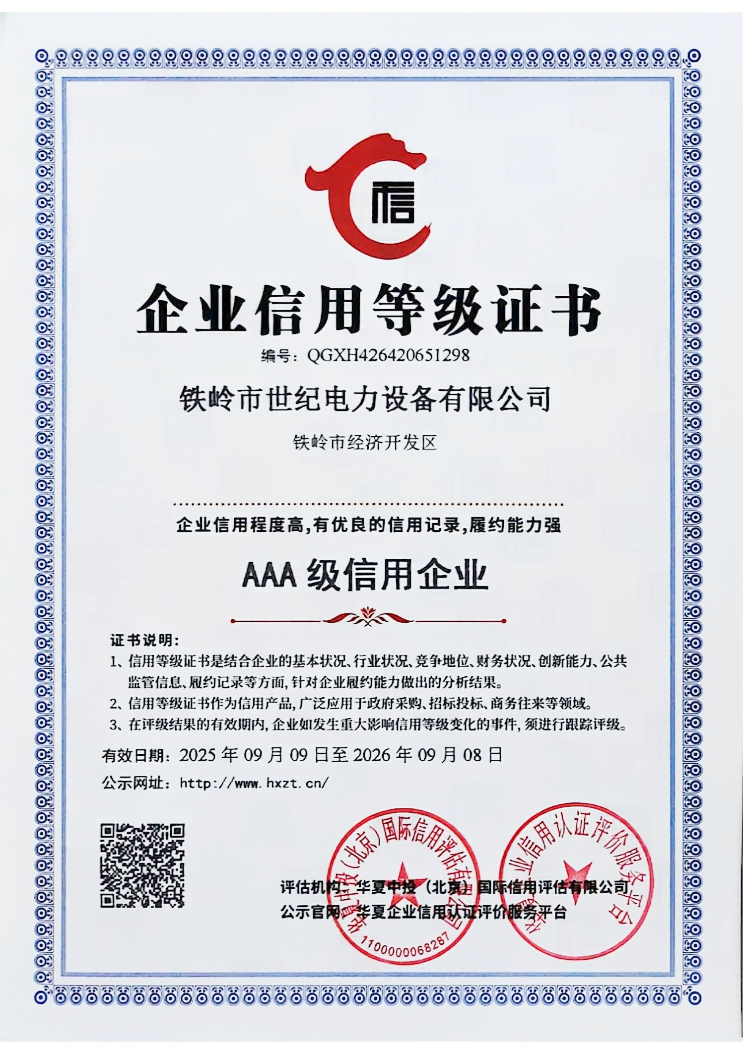 鐵嶺市世紀電力設備有限公司是集科研開發(fā)、生產制造、用戶服務于一體的國家高新技術企業(yè),始建于1999年,位于鐵嶺經濟開發(fā)區(qū),占地面積5萬余平方米,建筑面積2萬余平方米。主要從事國家電網配套戶外高低壓隔離開關、電力電纜、變壓器成套裝置、高低壓開關柜、箱式變電站、絕緣子等產品的研發(fā)、生產和銷售。公司現(xiàn)有國家發(fā)明專利6項、實用新型專利9項,公司通過了ISO9001國際質量管理體系認證、ISO14001環(huán)境管理體系認證和ISO 45001職業(yè)健康安全體系認證。